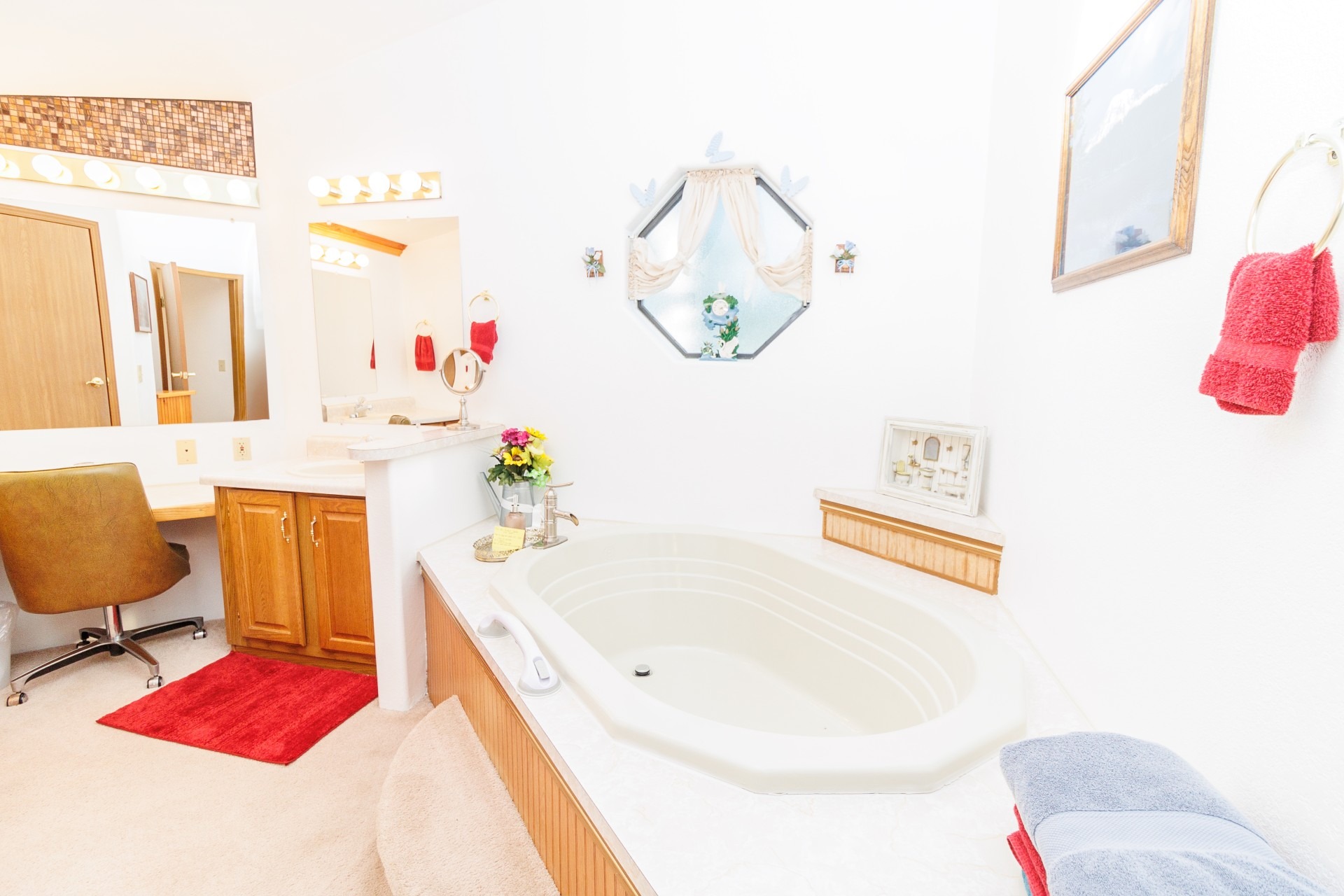 Our largest bedroom, which includes the California King bed with tons of drawer space. A relaxing garden tub and a full bathroom and shower all designed for your comfort. This room is fit for the ultimate relaxation, including a television for your favorite Netflix or Dish TV movies.